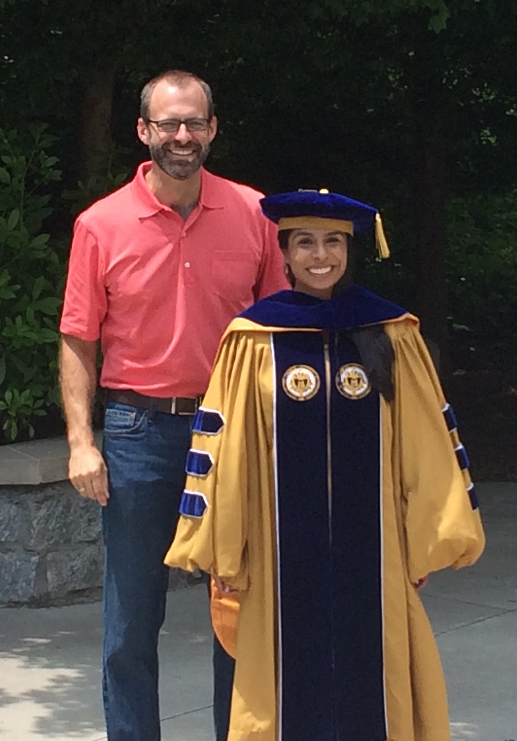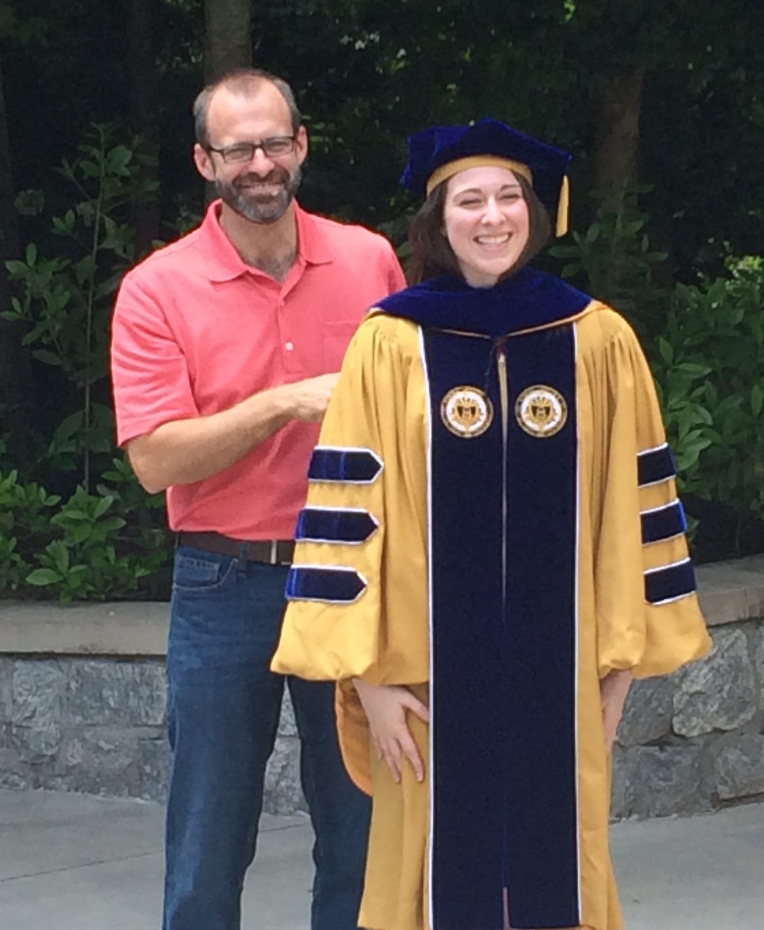 Since I wasn’t able to get back into town for graduation, we stepped outside for some post-facto hooding (pix below), including an appearance by Emily, who you will recall defended earlier in the semester. Congrats to all three grads!